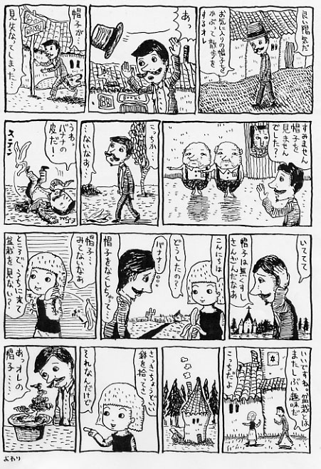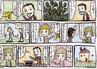 2005年自費出版本裏表紙用。2000年を5年も過ぎた今、バナナで滑って転ぶというギャグを本気でやっているのは、世界で僕ぐらいではないかと描いている途中思いました。でも、面白いよね?バナナで滑って転ぶのってさあ。面白いよね?ねえ?